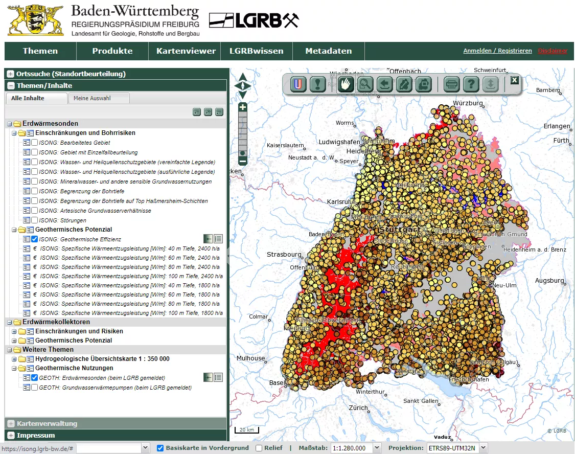 Bei der tiefen Geothermie wird der Untergrund in Tiefen von ca. 400 Metern bis zu mehreren Kilometern mit Tiefbohrungen erschlossen. Ähnlich wie bei der oberflächennahen Geothermie ist bis zu einer Tiefe von ca. 1500 Metern (z. T. auch als mitteltiefe Geothermie bezeichnet) eine Wärmepumpe erforderlich. Bei größeren Tiefen kann die Nutzung der geothermischen Energie aufgrund der höheren Temperaturen in der Regel direkt, d. h. ohne Niveauanhebung durch eine Wärmepumpe, genutzt werden. Die Erfolgsaussichten von Projekten der tiefen Geothermie sind stark von den hydrogeologischen und geothermischen Untergrundverhältnissen am jeweiligen Standort abhängig. In manchen Gebieten Baden-Württembergs sind zum Beispiel aufgrund der besonderen geologischen Gegebenheiten höhere Potenziale für eine hydrothermale Wärmenutzung vorhanden als anderswo – hierzu zählt insbesondere der Oberrheingraben sowie das Molassebecken des Alpenvorlands.